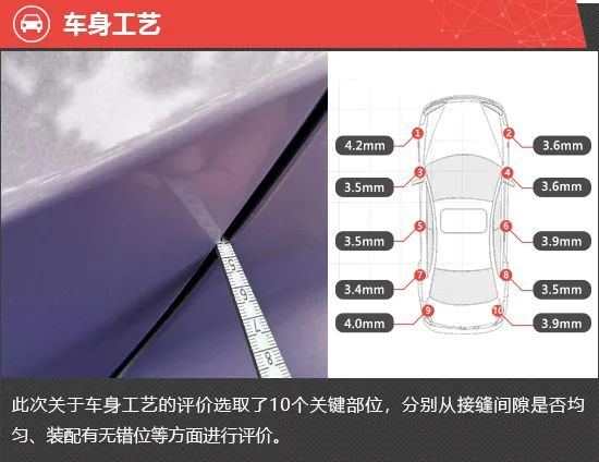 在车身工艺测试环节,整车共选取10个关键部位,每个关键部位都会选取3个关键点进行测量,以评价各关键部位缝隙的均匀程度。从测试结果来看,全车绝大部分关键部位的缝隙均值都控制在4.0mm以内,仅左前翼子板与前发动机舱盖连接处的缝隙均值稍高,达到了4.2mm。不过瑕不掩瑜,整车工艺水平表现出色。