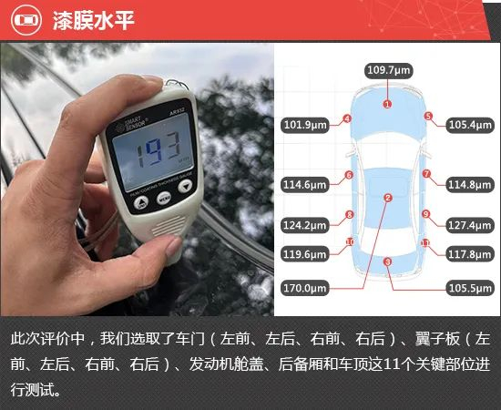 在漆膜水平测试环节,通过测试结果可以发现,整车漆膜平均厚度约为119.2μm,数据层面超过中级车标准值(≥90μm)。从各关键部位的测试数据来看,仅车顶处的漆膜厚度均值较高,其余部分的漆膜厚度表现中规中矩。
