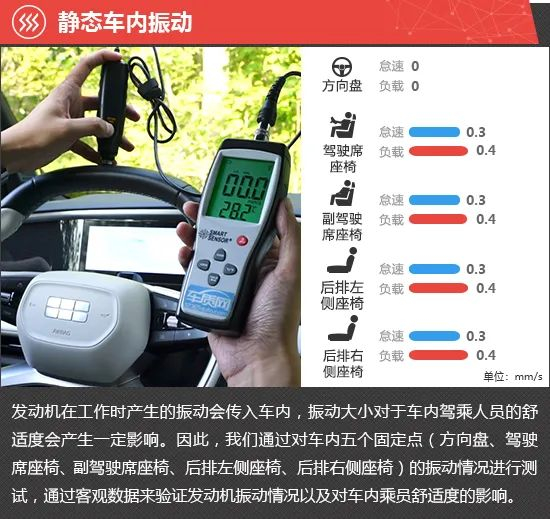 在静态车内振动测试环节,2023款吉利银河L7的方向盘在怠速和负载两种状态下均未测到振动数值。而车内所有座椅在两种状态下的振动数值分别为0.3mm/s和0.4mm/s,整体感受不明显,能提供不错的乘坐舒适性。