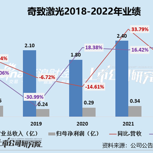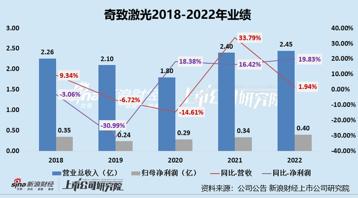 近年来,奇致激光的业绩表现并不稳定、业绩成长性存疑,2018-2022年,公司营收仅从2.26亿元增长至2.45亿元,归母净利润仅从0.35亿元增长至0.40亿元。