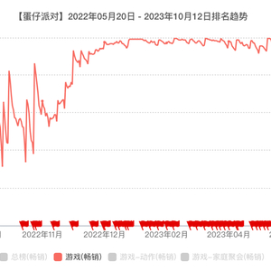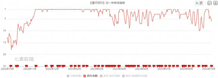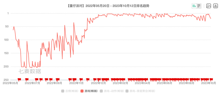 根据七麦数据,可以看到《蛋仔派对》刚上线时有过短暂的一波小高峰,之后约半年时间在畅销榜上的排名波动较大。