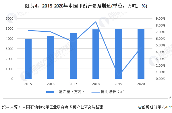 甲醇供给:产量逐年增加。从产量方面来看,随着新增产能的陆续投产以及装置开工水平的提升,甲醇产量稳步增加,区域性紧张局势逐步缓解。根据中国石油和化工工业联合会2021年公布的《2020年中国石油和化学工业经济运行报告》,2020年我国甲醇产量为4984万吨,上升4.7%。