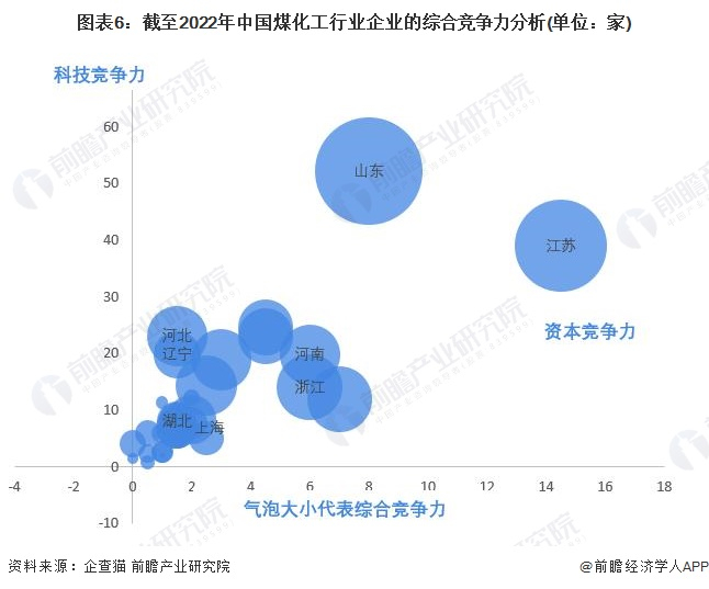 山东省的综合煤化工企业大数据竞争力最强。根据前瞻产业研究院对资本密集型产业、技术密集型产业和劳动密集型产业的不同对行业资本化、专利信息和风险进行不同的赋值,目前山东省的综合竞争力最强,其次为江苏省和浙江省。