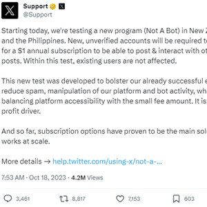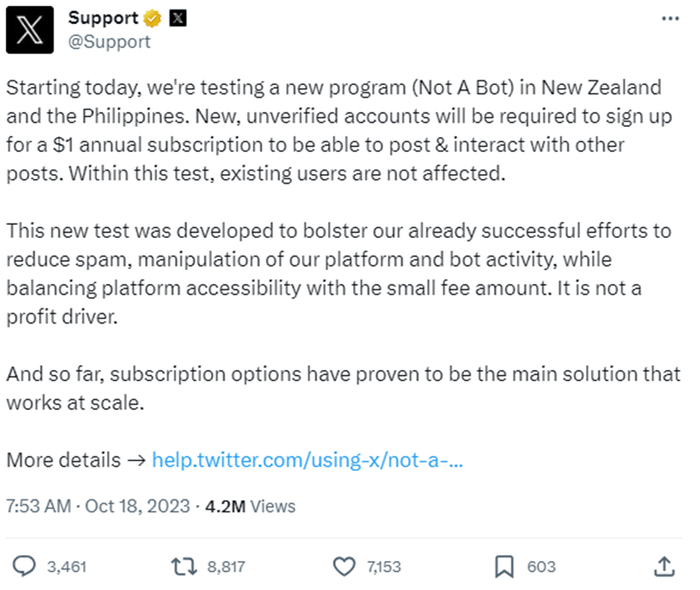 X称将先在新西兰和菲律宾的网站中试行,新用户需加入Not A Bot或者Premium蓝标计划,才能使用包括推文、回复、引用、转发、点赞、书签和创建列表在内的主要功能。而Premium蓝标计划每月收费8美元。