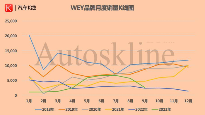 无独有偶。作为以魏建军姓氏命名的长城汽车高端品牌——WEY品牌,也在“金九”销售旺季出现销量环比下滑。