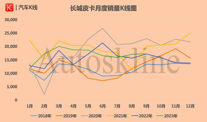 然而,从《汽车K线》统计的长城汽车近6年销量数据来看,长城皮卡不仅销量增速大幅回落,销量表现也不及2020年和2021年同期。