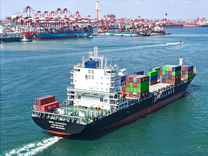 8月30日,“中外运海口”轮缓缓驶离山东港口青岛港(无人机照片)