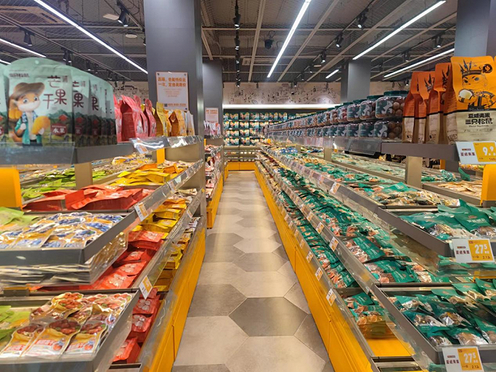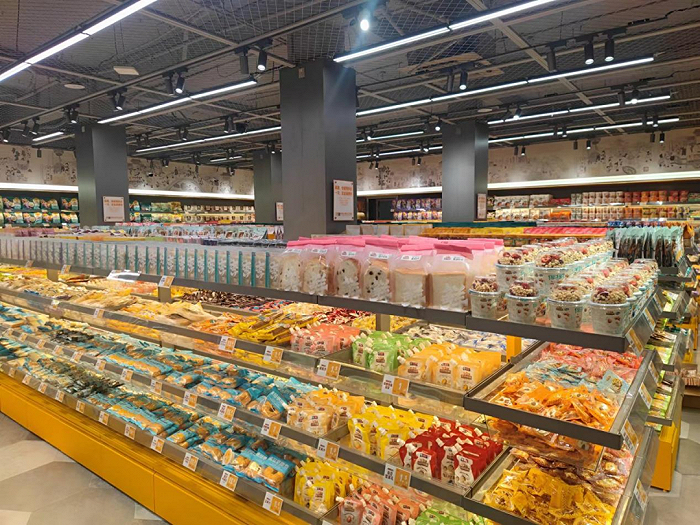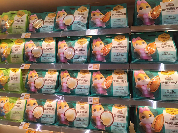 三只松鼠社区零食店在门店设计上对于门店、商品整体采取一体化设计,中岛货架则是采用了以囤货属性为设计目标的篮子造型。从货架最上面开始摆放的商品,依次是普通规格的商品,散称规格的商品,而在门店最深处的货架里摆放的是三只松鼠针对线下门店设计的量贩大包装,规格上分别为500g以及1000g。