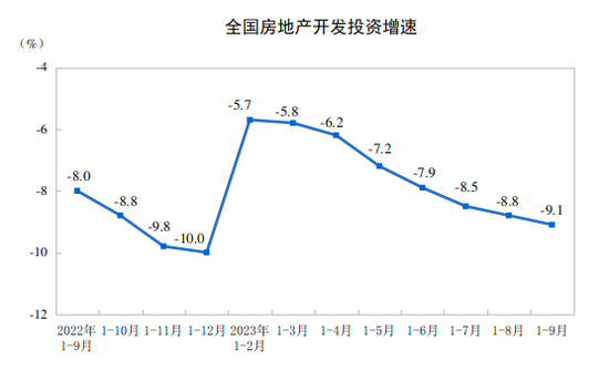 10月18日,国家统计局数据显示,1—9月份,全国房地产开发投资87269亿元,同比下降9.1%;其中,住宅投资66279亿元,下降8.4%。1—9月份,商品房销售面积84806万平方米,同比下降7.5%,其中住宅销售面积下降6.3%。商品房销售额89070亿元,下降4.6%,其中住宅销售额下降3.2%。1—9月份,房地产开发企业到位资金98067亿元,同比下降13.5%。其中,国内贷款12100亿元,下降11.1%;利用外资36亿元,下降40.0%;自筹资金31252亿元,下降21.8%;定金及预收款33631亿元,下降9.6%;个人按揭贷款17028亿元,下降6.9%。