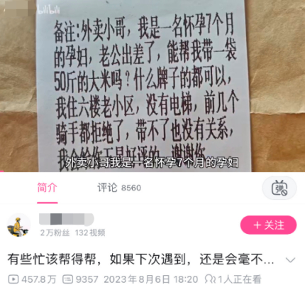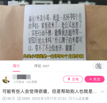 这个以分享外卖员工作为主要内容的账号,发布了100余条视频,其中很多是讲述顾客的“奇葩要求”。记者注意到,几个月前,该博主也曾帮一位“怀孕8个月的孕妇”送了50斤大米,视频播放量达95万。