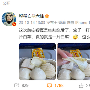 此前,“峰哥亡命天涯”在微博中写道:“这次航空餐真是空前绝后了,盒子一打开我都惊了,四个馒头,一包榨菜,还有一片白菜,真的就是一片白菜!这么多年头一次看到这么奇葩的航空餐。”