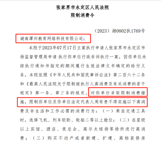 投诉处罚之外,潭州教育的经营也似乎遇到了挑战。今年9月1日,张家界永定区人民法院对湖南潭州教育网络科技有限公司出具限制消费令,对公司及法人周有贵采取限制消费措施。
