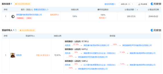 蓝鲸财经发现,“易学课堂”的开发者是湖南播课有声在线教育科技有限公司,天眼查显示,该公司曾用名是“湖南潭州在线教育科技有限公司”,成立于2018年,法人李湘宁。公司控股股东是湖南潭州教育网络科技有限公司,正是当初“潭州教育”的经营方,受益所有人也是该公司的法人周有贵。