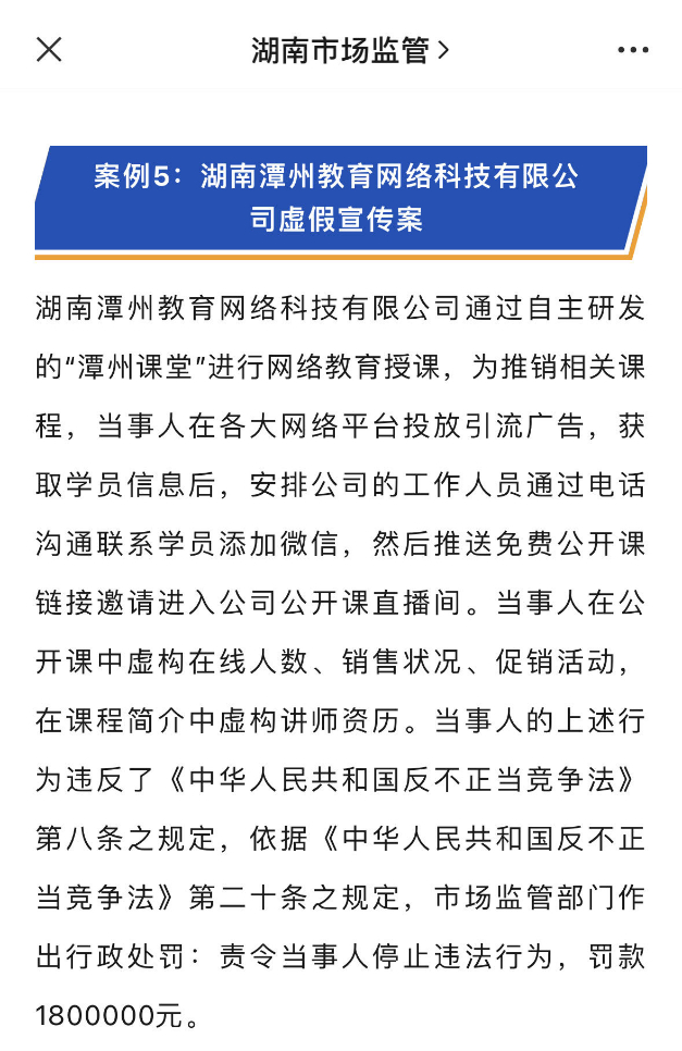 今年6月,湖南省市场监督管理局官方微信发布通报称,潭州教育通过自主研发的“潭州课堂”进行网络教育授课,为推销相关课程,当事人在各大网络平台投放引流广告,获取学员信息后,安排公司的工作人员通过电话沟通联系学员添加微信,然后推送免费公开课链接邀请进入公司公开课直播间。当事人在公开课中虚构在线人数、销售状况、促销活动,在课程简介中虚构讲师资历。当事人的上述行为违反了《中华人民共和国反不正当竞争法》第八条之规定,依据《中华人民共和国反不正当竞争法》第二十条之规定,市场监管部门作出行政处罚:责令当事人停止违法行为,罚款180万元。