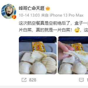 “这次航空餐真是空前绝后了,盒子一打开我都惊了,4个馒头,一包榨菜,还有一片白菜,真的就是一片白菜!这么多年头一次看到这么奇葩的航空餐。”14日下午,“峰哥亡命天涯”微博写道。