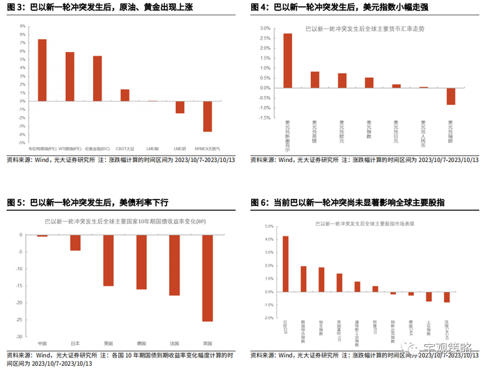 光大证券指出,当前巴以新一轮冲突尚未显著影响全球主要股指,巴以新一轮冲突发生后,虽然市场避险情绪有所回升,但尚未显著影响全球主要权益市场,2023年10月7日至2023年10月13日,日经225指数、韩国综合指数、恒生指数、英国富时100指数、道琼斯工业指数、标普500指数分别上涨4.3%、2.0%、1.9%、1.4%、0.8 %、0.4%,而上证指数小幅下跌0.7%。