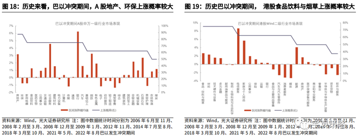 行业方面,历史上巴以冲突期间,A股地产、环保以及港股食品饮料与烟草、材料等行业上涨概率较大,而A股银行、社会服务以及港股电信服务、家庭与个人用品平均涨幅相对靠前。