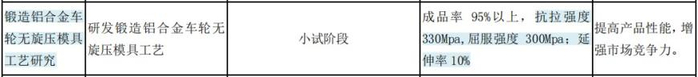 招股书中,宏鑫科技披露其可比公司今飞凯达在研项目“锻造铝合金车轮无旋压模具工艺研究”中铝合金车轮的性能指标,分别为:抗拉强度——330Mpa、屈服强度——300Mpa以及延伸率——10%,并称该数据源于今飞凯达2021年年报。