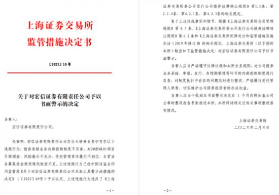值得注意的是,宏信证券今年债券业务因存在债券承销业务内部控制制度不完善,对20西峡01项目尽职调查、风险揭示不充分,受托管理责任履行不到位,主营业务募集资金使用情况核查不足等违规行为被上海证券交易所出具警示函。
