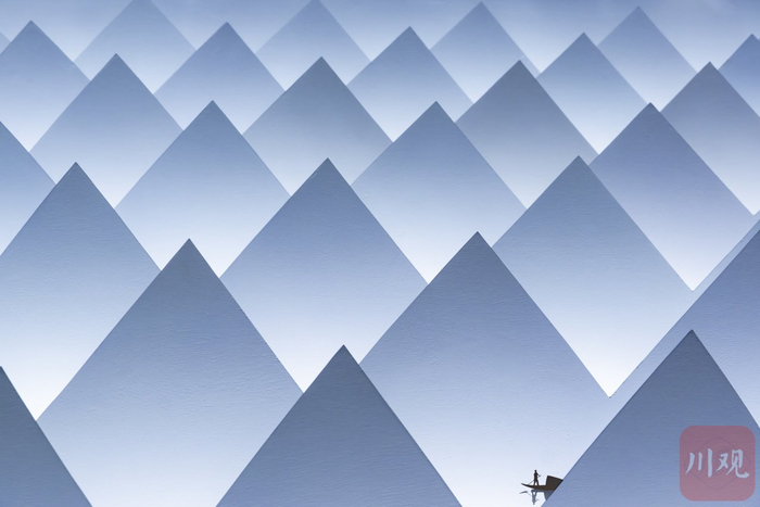 拍摄于成都“百分号%的咖啡馆”的天花板,其建筑风格很像山峦,通过后期加入了设计元素,取名轻舟已过万重山。