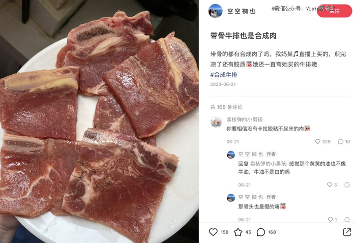 带骨牛排也可以是合成肉,甚至能骗过混迹肉摊数年的大爷大妈。经历过这样信仰崩塌、常识被冲击的时刻,谁敢说还能用一如往昔的单纯眼光看待所有肉片?