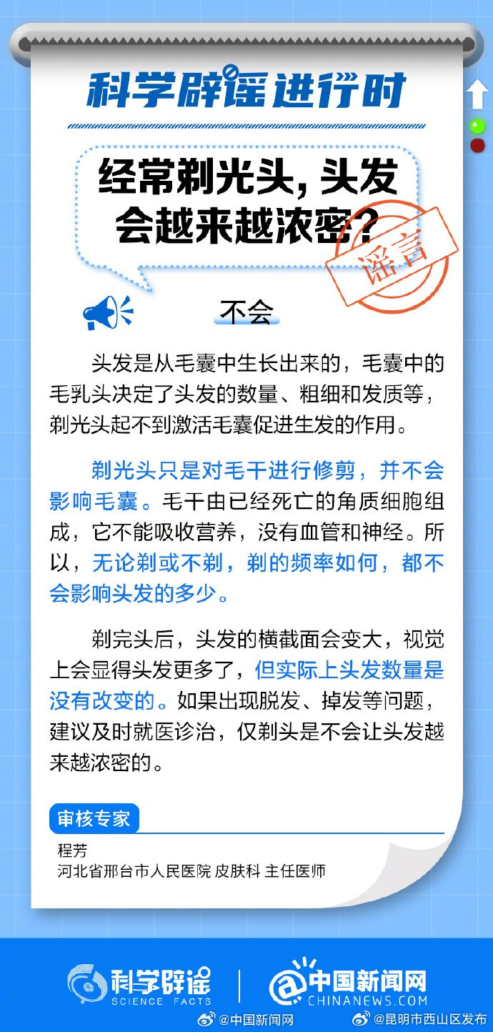 经常剃光头头发会变浓密吗? 昆明信息港 昆明信息港官方账号 2023.10.1816:29 关注 头发是从毛囊中生长出来的,毛囊中的毛乳头决定了头发的数量、粗细和发质等,剃光头起不到激活毛囊促进生发的作用,无论剃或不剃,剃的频率如何,都不会影响头发的多少。如果出现脱发、掉发等问题,建议及时就医诊治。#科学辟谣进行时#(来源:@科学辟谣 @中国新闻网 )