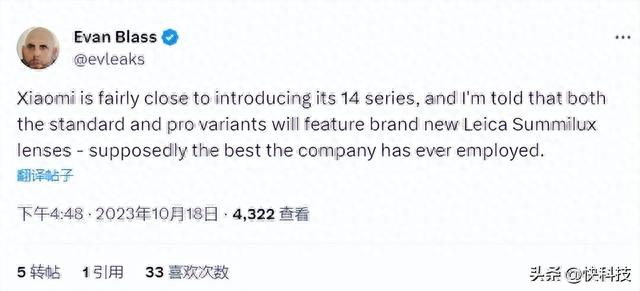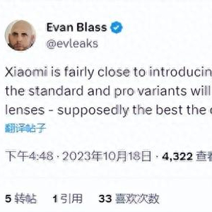 快科技10月18日消息,大神@evleaks 最新爆料称,小米14系列发布在即,标准版和Pro版都将配备全新的徕卡Summilux 镜头——据说是该公司有史以来使用过的最好的镜头。
