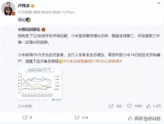 市场调研机构Canalys发布2023年Q3全球智能手机市场报显示,2023年第三季度,小米以14%的份额排名第三,市场份额达到2021Q3以来新高。