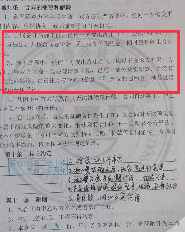 根据投诉人提供的合同显示,约定施工过程中,任何一方提出终止合同,应以书面形式向另一方提出,经双方协商一致办理清算手续,已施工部分按实结算,并签订终止合同协议,由责任方按合同总价款15%支付违约金,涉及过错赔偿的费用另计;合同签订后施工前,任何一方提出终止合同的,按合同总价款5%支付违约金;工程延期赔偿,按照50元/天计算。