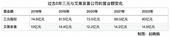 从三元股份的最近5年经营数据看,它的冰淇淋业务并没能像伊利、蒙牛等企业获得双位数增长。2020年至2022年,艾莱发喜经营数据为12.2亿元、14.2亿元、14.8亿元,增速平缓。