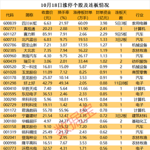 10月18日,A股三大指数集体收跌。个股方面,共43股涨停(包含5只ST股)。另外,8股封板未遂,整体封板率为82%。