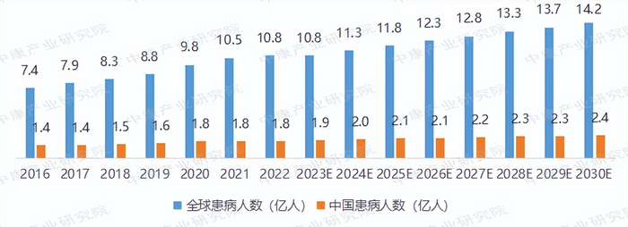 《2021中国高尿酸及痛风趋势白皮书》显示,目前我国高尿酸血症的总体患病率为13.3%,患病人数约为1.77亿,其中18~35岁的年轻患者占比近 60%。据预测,全球患者人数2030年将达14.2亿人,预计我国高尿酸血症及痛风患病人数会在2030年达到2.4亿人。