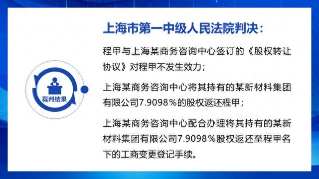 原告程甲诉称:程某在未征得程甲同意亦未告知程甲的情况下,与上海某商务咨询中心签订《股权转让协议》,将程甲所持有的某新材料集团有限公司的股权转让至程某控制的上海某商务咨询中心名下,并已完成工商变更登记手续。程甲认为,其所持有的某新材料集团有限公司的股权系其个人合法资产,程某在程甲毫不知情的情况下,将该股权转让至其实际控制的上海某商务咨询中心名下,对程甲合法权益造成了严重侵害。