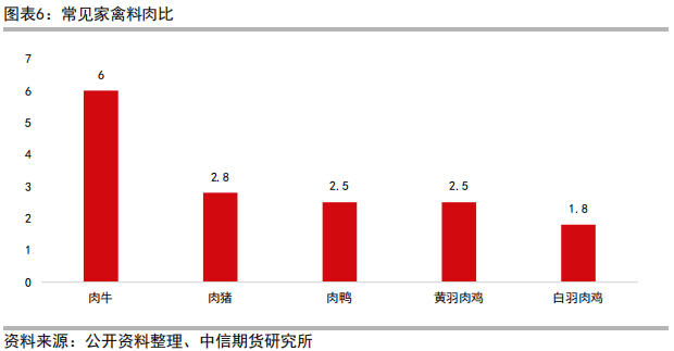 料肉比指的是饲养牲畜所用饲料的重量与牲畜体重的比重,是一种衡量饲料投入与肉量产出的指标,料肉比越低,说明牲畜的生产效率更高,投入少,产出高,反之则说明生产效率低,投入多,产出的肉量少。在常见的肉类来源中,白羽肉鸡具有最低的料肉比,大约为1.6-1.8,低于黄羽肉鸡、肉鸭、肉猪、肉牛,其中,肉牛和家猪的料肉比远高于白羽肉鸡,肉牛料肉比约为6,生猪料肉比约为2.8。