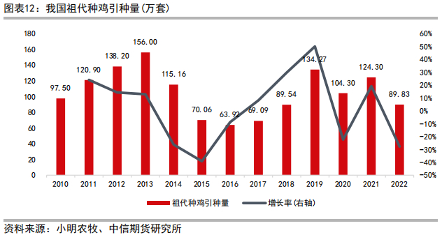 禽流感导致我国从国外引种祖代鸡变得更加困难,我国祖代种鸡引种量在2022年大幅下降,2022年引种祖代鸡89.83万套,同比降低27.73%。由于国内祖代鸡生产能力暂时不能完全满足国内市场需求,禽流感的出现对我国鸡肉供应、鸡肉价格都会产生影响。