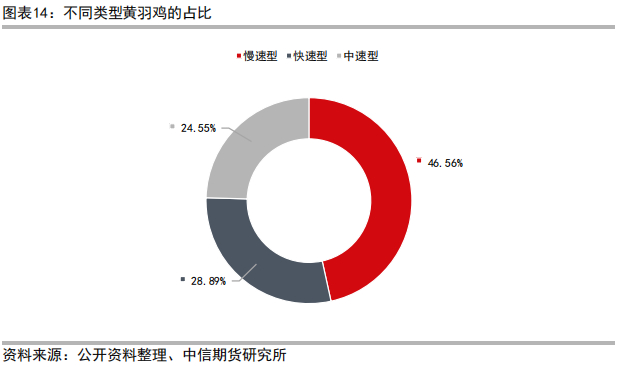 快速型黄羽肉鸡生长周期最短,大约42-65天可以出栏,出栏体重大约为1.5公斤,一般而言,优质的黄羽肉鸡需要100天以上的时间才能出栏。当前中国市场上的黄羽肉鸡平均出栏时间大约为85天,而土杂鸡的出栏时间更是在120天以上。中国畜牧业协会的数据显示,至2021年,慢速鸡在黄羽鸡市场的占比最高,达46.56%,中速鸡和快速鸡占比相差不大,分别为24.55%和28.89%。