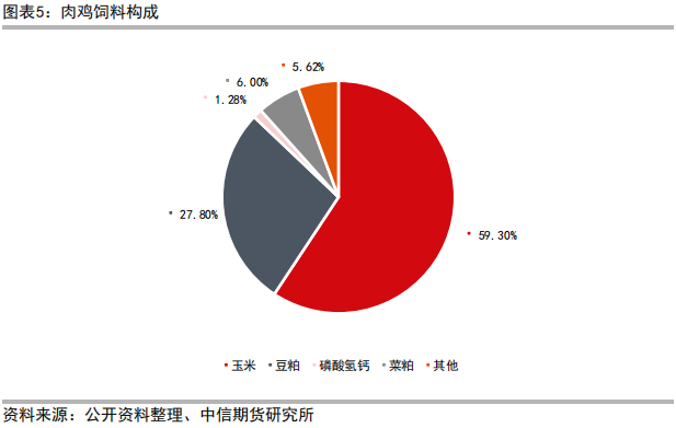 肉鸡饲料的构成以玉米、豆粕、菜粕、磷酸氢钙为主,并搭配使用油、盐、维生素、矿物质、益生菌等添加剂,其中,玉米和豆粕是肉鸡饲料中最主要的成分。平均而言,肉鸡饲料中玉米占59.3%,豆粕占27.8%,菜粕占6%,磷酸氢钙占1.28%,玉米和豆粕合计占87.1%。