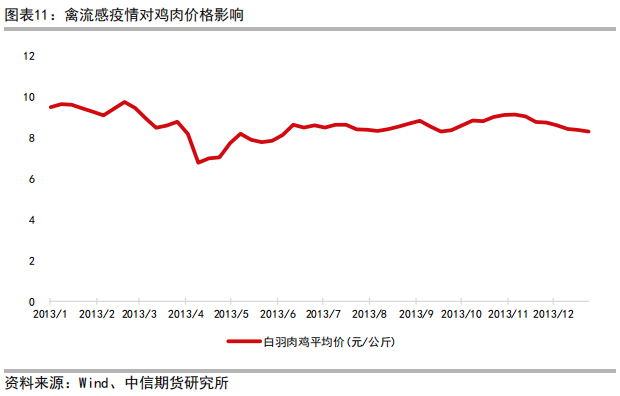 禽流感导致相关国家鸡肉安全和出口供应难以得到保障,且部分禽流感病毒是人畜共患病,由于中国国内民众对于使用鸡肉食品可能产生的安全问题的担忧,再加上鸡肉不是中国主要的肉食消费品,因此人们很可能在禽流感期间减少对鸡肉的消费,中国国内需求在禽流感严重期间快速萎缩,导致鸡肉价格下降。如2013年3-5月,在中国禽流感爆发阶段,白羽肉鸡价格明显呈现出下降趋势,可以看出禽流感对消费者心态影响显著。