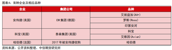 当前肉鸡市场上的主要白羽鸡育种公司有安伟捷(Aviagen)、科宝(Cobb-Vantress)、哈伯德(Hubbard)三家公司,三者占全球市场份额在95%以上。
