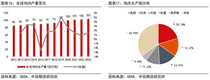 由于全球生产能力的提高,鸡肉生产量总体上呈现稳步增长的趋势,但2016年也出现了全球鸡肉产量的下降,2012年全球鸡肉总产量为84.91百万吨,到2023年预计产量为103.52百万吨,年均复合增长率达1.66%,近年来,全球鸡肉产量增长放缓,自2019年同比增长率达到5.03%的高峰后,增长率呈现下降趋势,2022年同比增长率仅为0.85%。