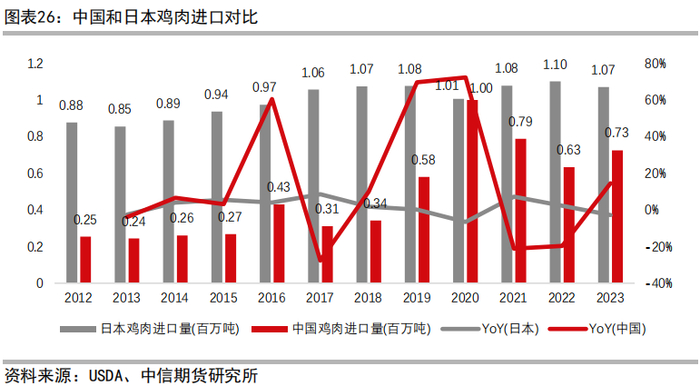 日本鸡肉历年进口量较为稳定,自2017年以来,日本鸡肉进口量维持在1.06百万吨左右。中国鸡肉进口量波动较大,2012-2020年鸡肉进口呈增长趋势,2012年进口量达0.25百万吨,到2020年达1百万吨,但2020年之后,鸡肉的进口量又迅速下降,到2022年,鸡肉进口下降为0.63百万吨。