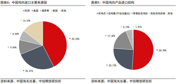 我国鸡肉进口的主要来源国为巴西、美国、俄罗斯、泰国等国家,进口的鸡肉产品主要有冻鸡爪、冻鸡翼(不包括翼尖)、带骨的冻鸡块、其他冻鸡杂碎等,根据海关总署的数据,2022年鸡肉进口的来源国中,来自巴西的鸡肉进口占比最大,达42.42%,全年主要进口的鸡肉产品为冻鸡爪,占进口量的50.99%。
