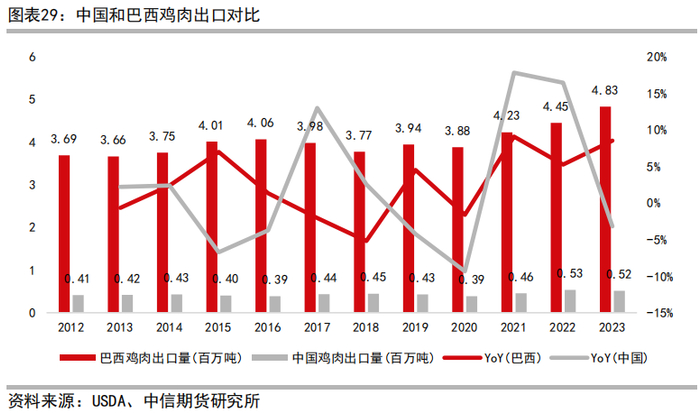 国际层面,我国是鸡肉的生产、消费大国,USDA数据显示,中国是世界第三大鸡肉生产国、第二大鸡肉消费国,占全球鸡肉生产量的14.3%,消费量的14.72%。据USDA预估,2023市场年度我国鸡肉产量14.3百万吨,占全球的13.81%;消费量14.51百万吨,占全球的14.38%;进口量0.725百万吨,占全球的6.51%。
