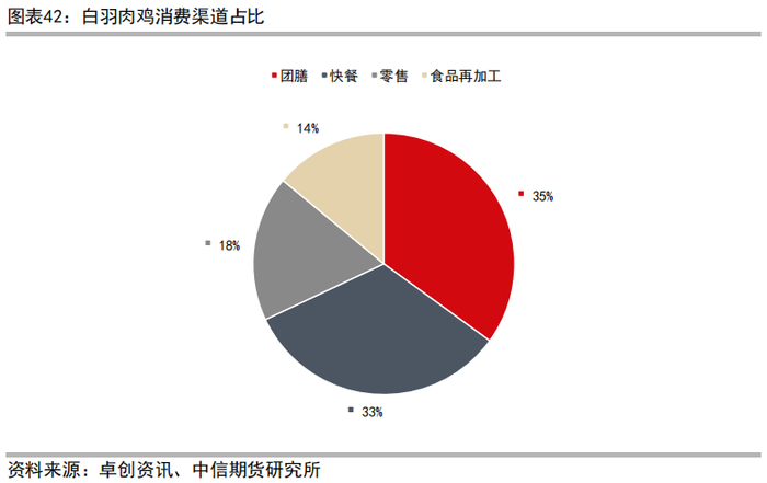 下游来看,白羽肉鸡的需求方为屠宰场、餐饮企业、肉制品加工行业和消费者,主要通过团膳、快餐、零售、食品加工的方式流入市场,其中团膳约占35%,快餐约占33%,为白羽肉鸡的主要销售渠道。