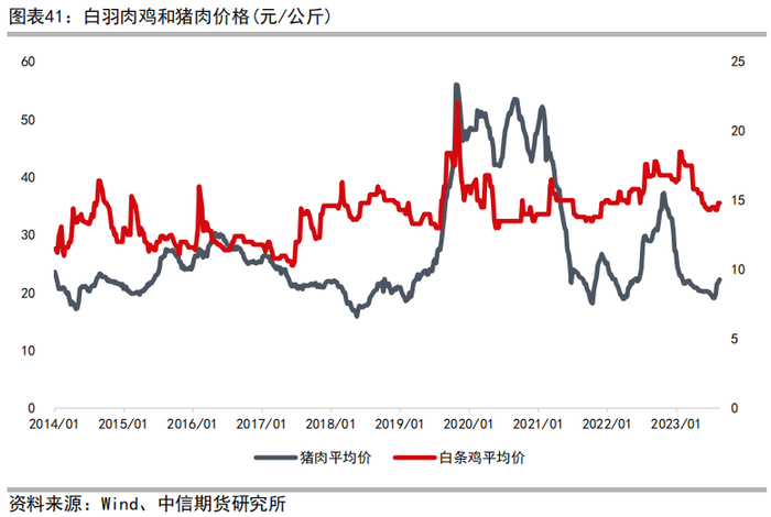 然而,自2018年6月起,猪肉价格在经历了短暂的低谷后,开始急速攀升,Wind数据显示,2018年1月5日市场平均猪肉价格为21.73元/公斤,此后市场价格整体上不断上升,至2020年2月14日,猪肉平均价格已经达到51.56元/公斤,平均日度增长率达到0.84%。在2019年至2021年猪肉价格维持高位期间,鸡肉的价格在13-20元/公斤之间波动,这段时间里,鸡肉的消费量维持高位并与猪肉消费量呈相反的走势,而自2022年起,随着猪肉价格逐渐恢复正常,鸡肉的消费量则开始走低,与猪肉消费反向变动。