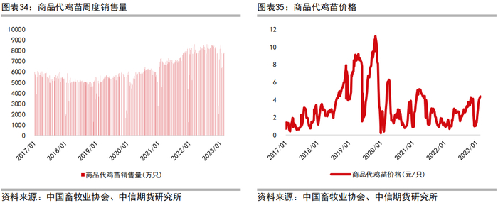 商品代鸡苗销售量总体也呈现先减后增的趋势,2017年至2019年,商品代鸡苗销售量波动下降,周度销量在5000-6000万只波动,此后销量呈现上升趋势,直至2022年11月。