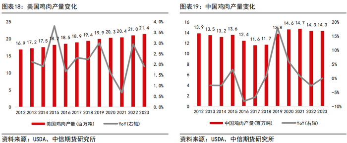 美国作为全球最主要的鸡肉生产国,其生产能力长期维持增长的态势,从2012年生产量16.86百万吨,到2022年生产20.99百万吨,年平均增长率达2.01%,但是近年来,美国鸡肉生产量增速也逐渐放缓,受新冠疫情的影响,2020年产量增速为1.57%,2021年增速仅为0.67%,到2022年鸡肉产量的增速才有所恢复。