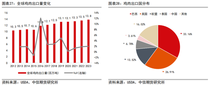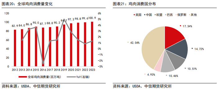 鸡肉是世界上重要的肉类消费品,自2012年以来,鸡肉消费量都呈现出上升趋势,且走势基本与全球鸡肉产量相同,自2016年起,鸡肉消费量逐年上升,2016年全球鸡肉消费达87.66百万吨,到2023年,鸡肉消费达100.89百万吨,年复合增长率达1.65%,近年来鸡肉产品的消费增速在不断放缓,从2019年起,同比增长率不断下降,2022年鸡肉消费同比增长仅为0.83%,基本与全球鸡肉产量的增速持平。