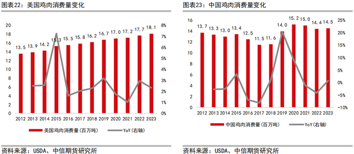 在消费量上,美国仍然是世界上最大的国家,消费量占全球的17.34%,中国鸡肉消费占全球比重为14.72%,位居世界第二。美国鸡肉消费量自2012年起就呈现逐年递增的趋势,2012年消费鸡肉13.5百万吨,到2022年消费鸡肉17.7百万吨,年平均增长率为2.44%。