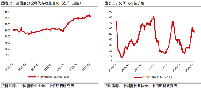 祖代存栏量自2017年至今总体趋势先减后增2017年1月初,祖代存栏约131.98万套,到2018年9月中旬,祖代存栏下降到109.67万套,此后存栏量不断走高,直至2020年11月底,达156.52万套,从2020年12月开始至2023年2月,祖代存栏量基本维持稳定,存栏量在160-180万套之间波动。